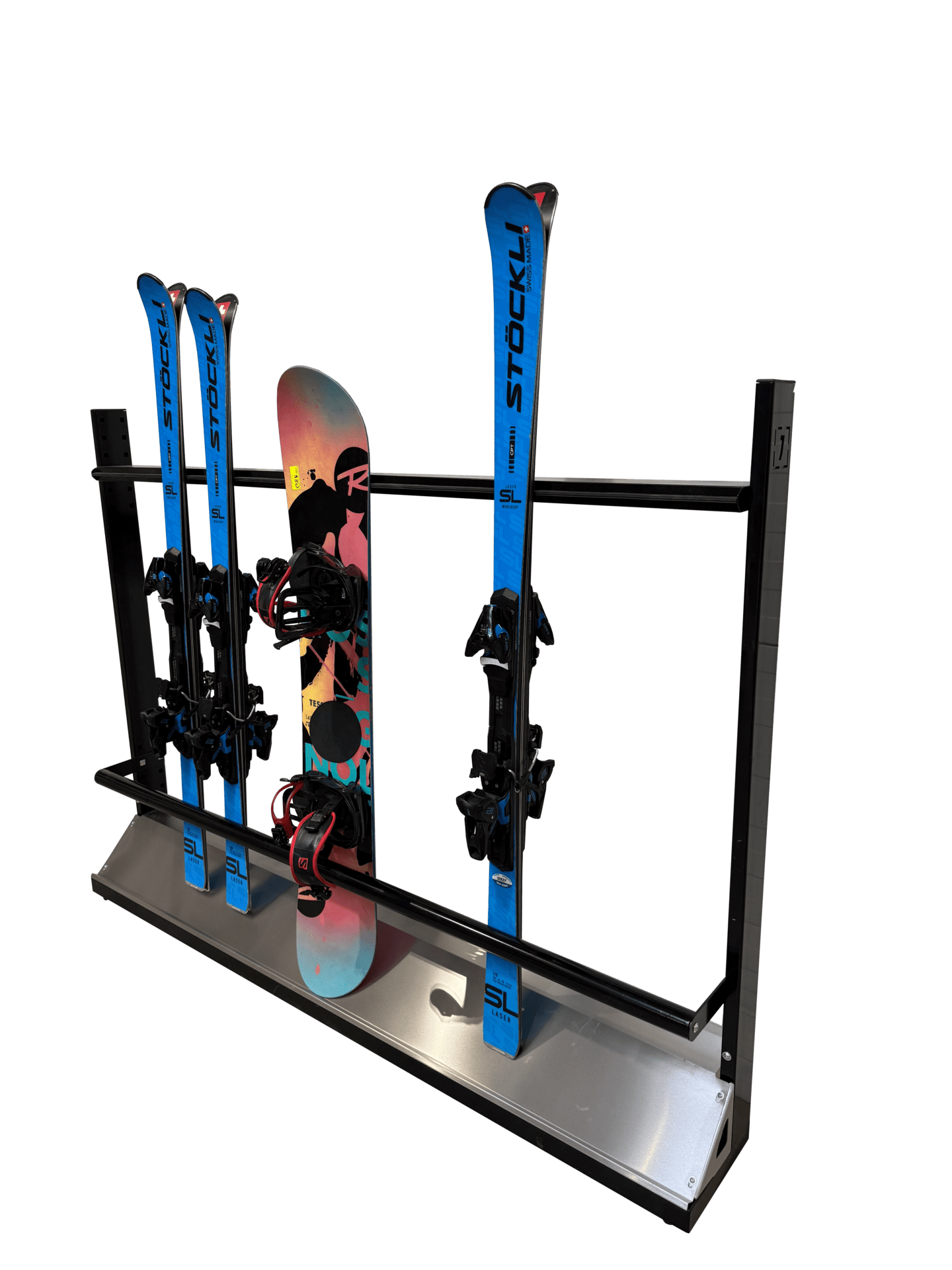 Stojak RENTAL na deski snowboardowe z regulacją wysokości i systemem jezdnym.