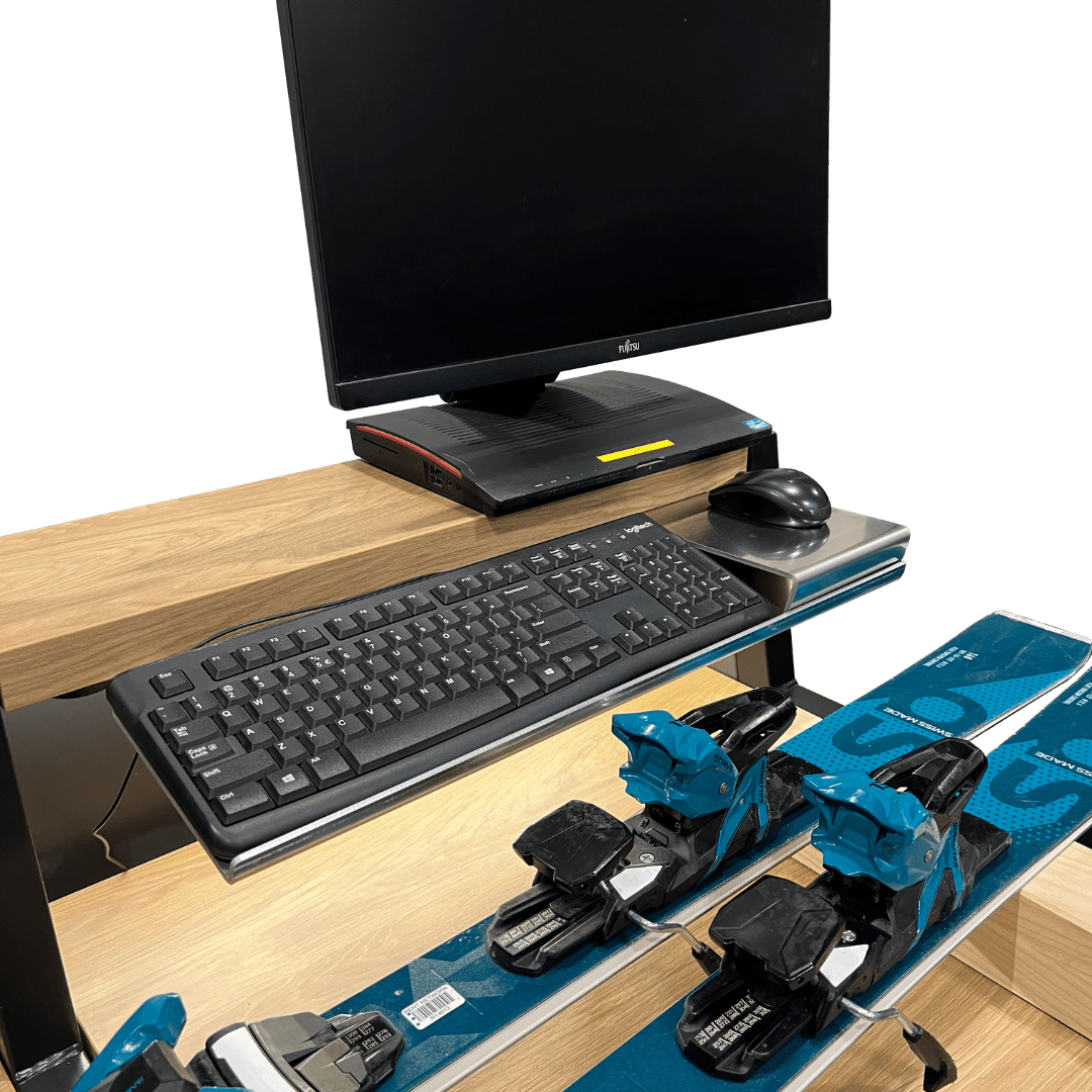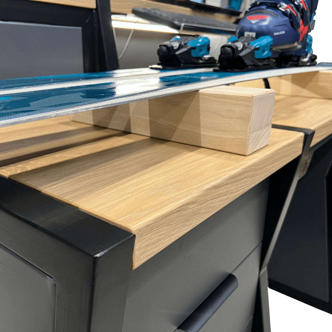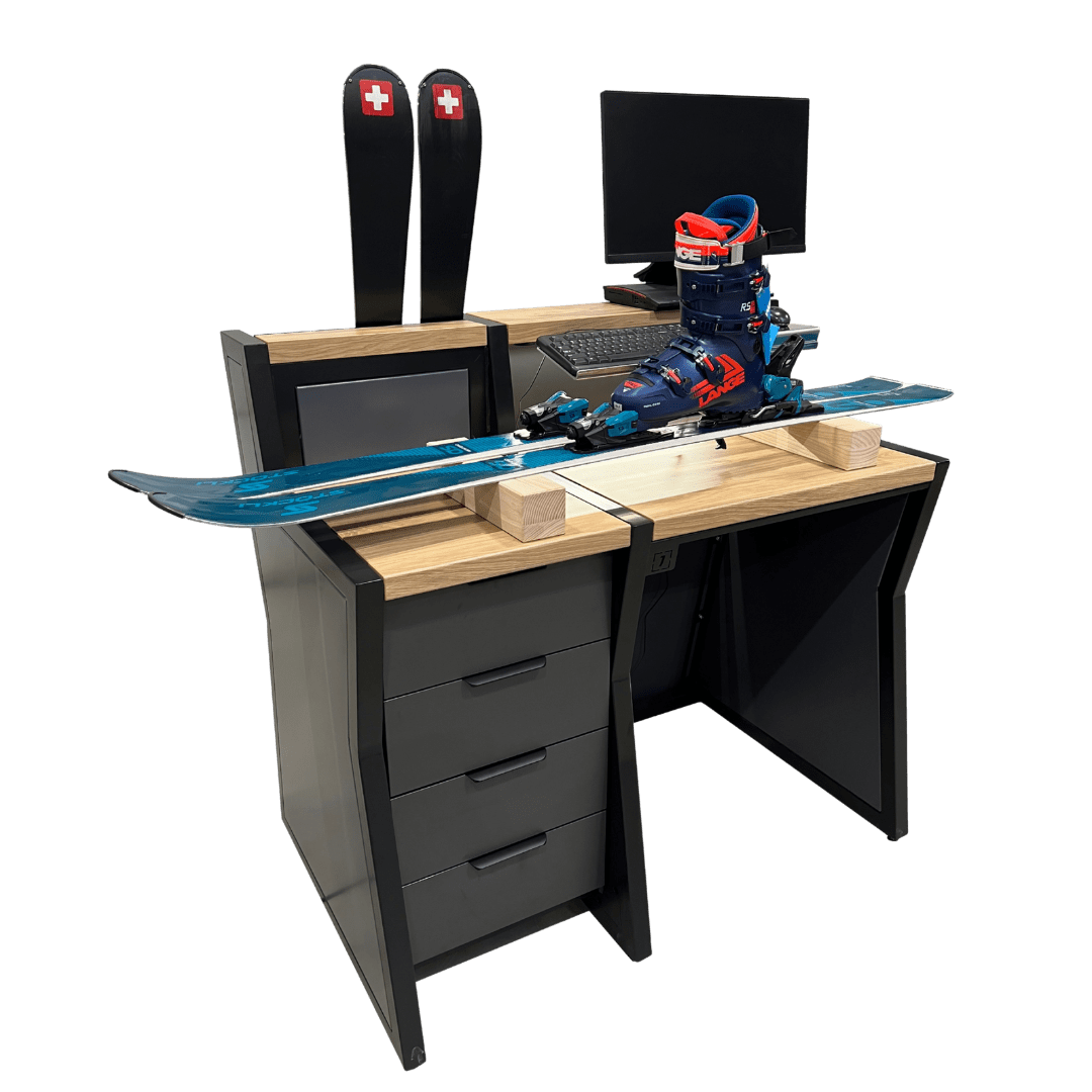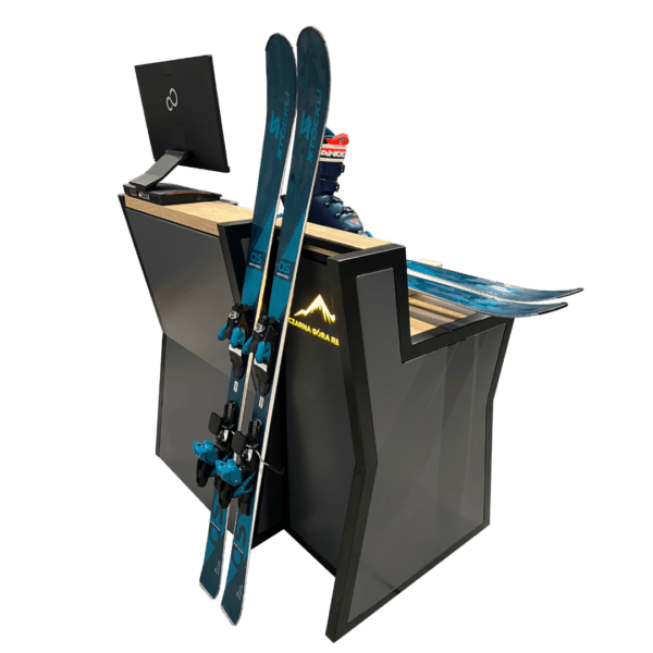 Konstrukcja zapewnia wygodę zarówno pracownikowi, jak i klientowi – specjalne podpory umożliwiają swobodną regulację wiązań, a miejsce do oparcia nart zwiększa komfort obsługi. Możliwość personalizacji kolorystyki oraz dodania podświetlanego logotypu pozwala dopasować stanowisko do identyfikacji wizualnej marki.