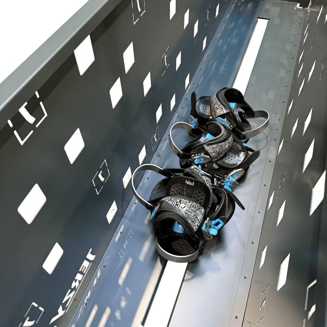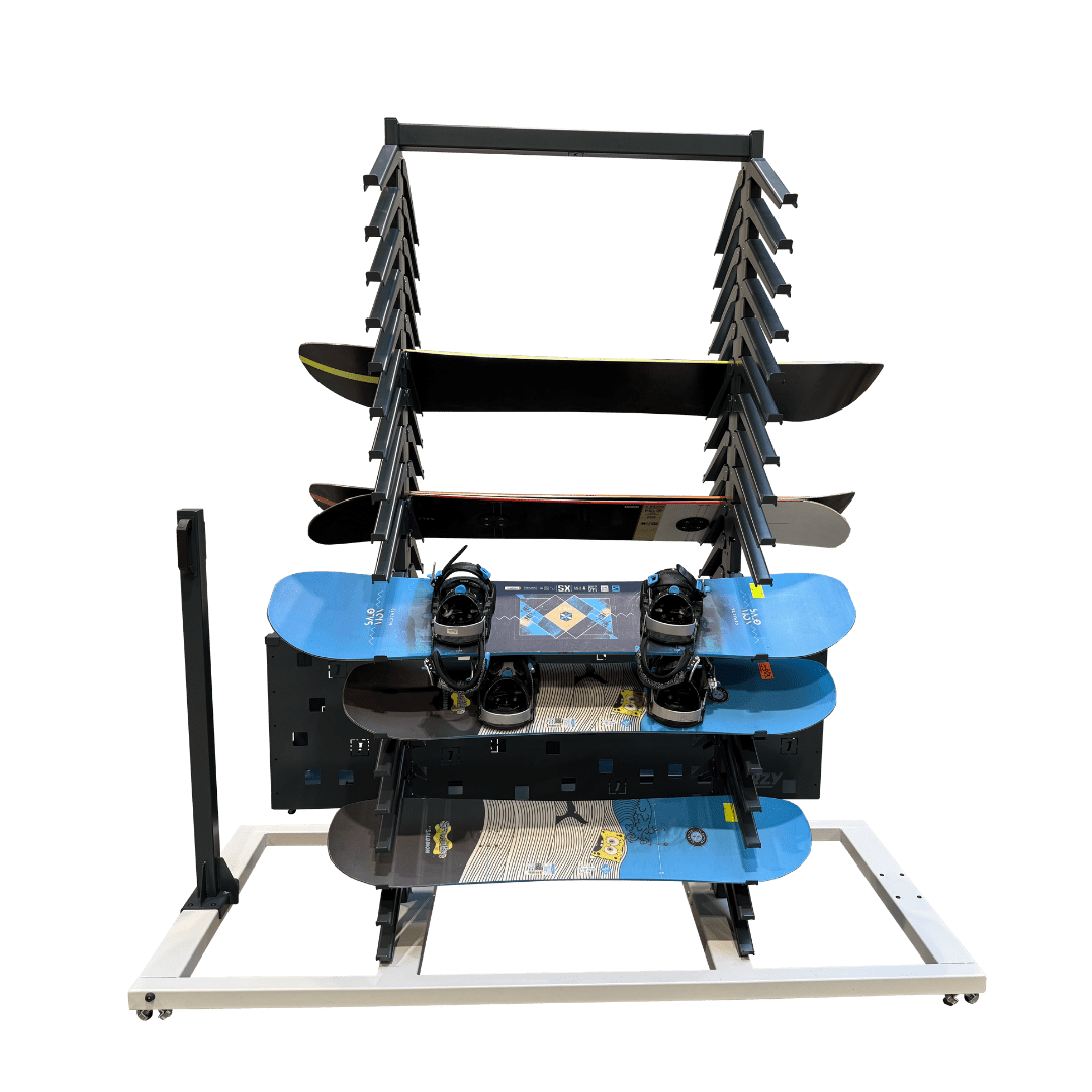 Stojak RENTAL na deski snowboardowe z regulacją wysokości i systemem jezdnym.