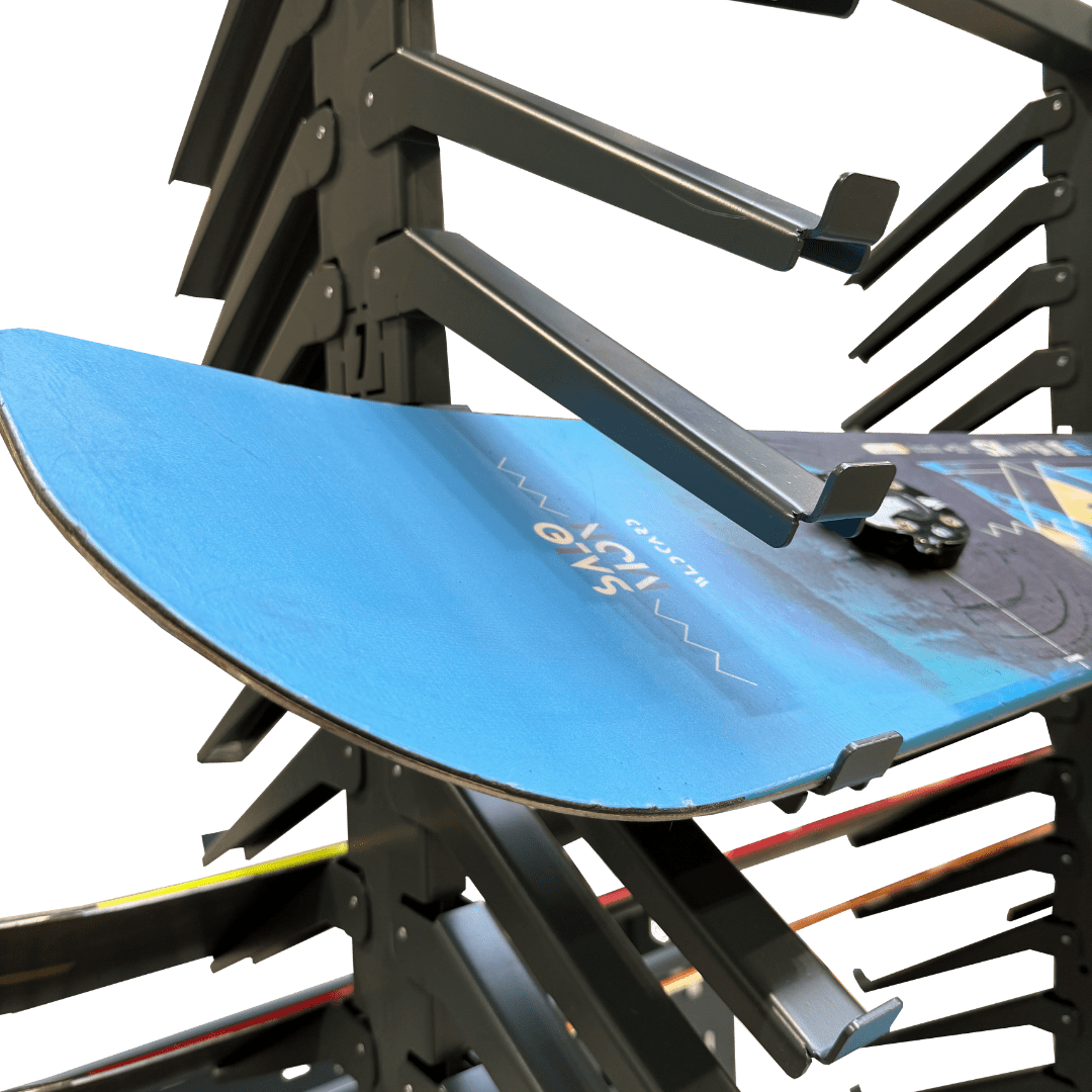 Stojak modułowy na deski snowboardowe to profesjonalny system magazynowania zaprojektowany do obsługi dużej ilości sprzętu snowboardowego w wypożyczalniach. Dedykowane wieszaki typu RENTAL zapewniają bezpieczne i stabilne przechowywanie desek wraz z wiązaniami, nawet przy intensywnym użytkowaniu.