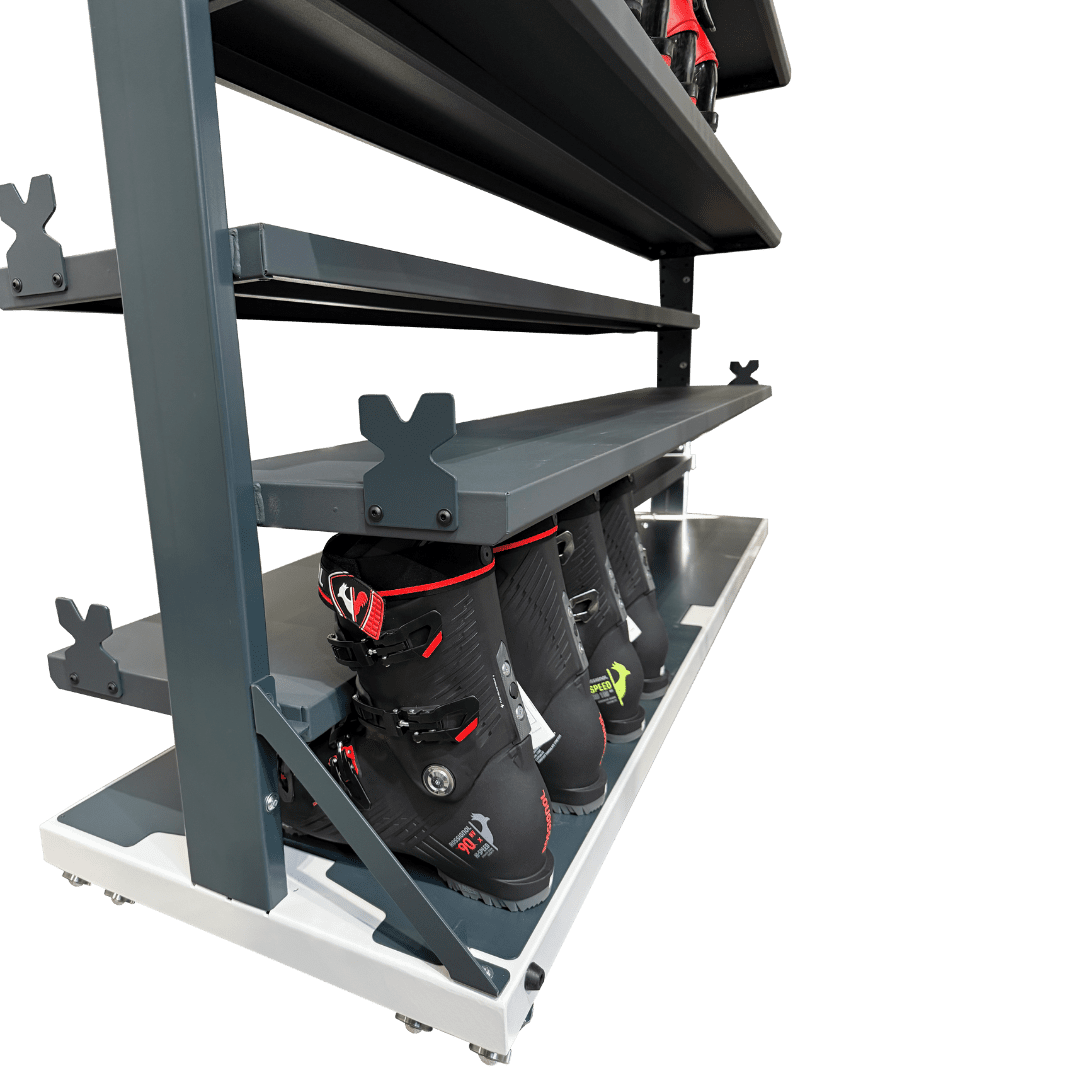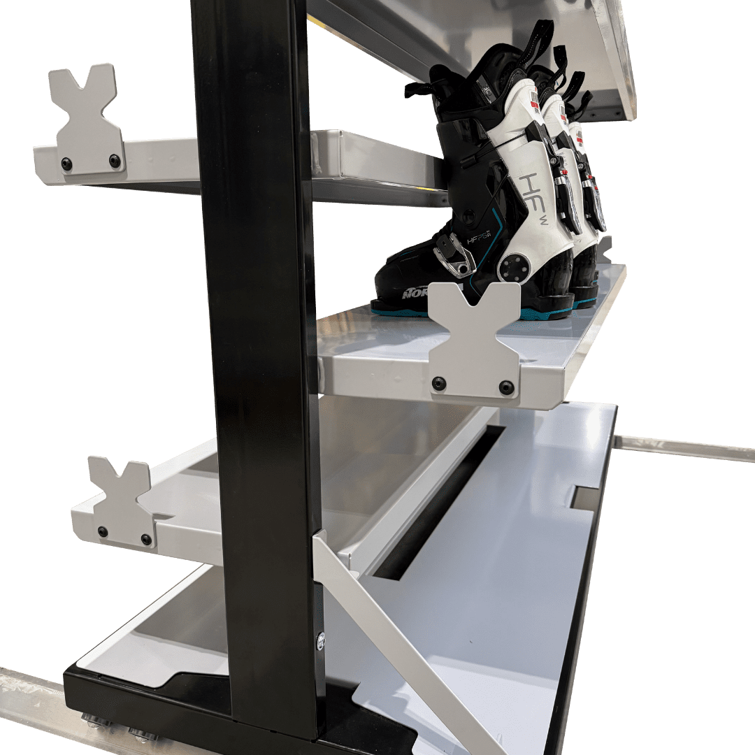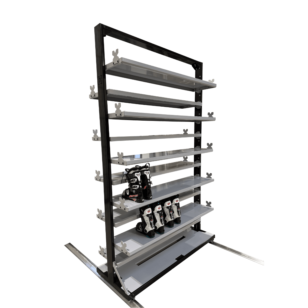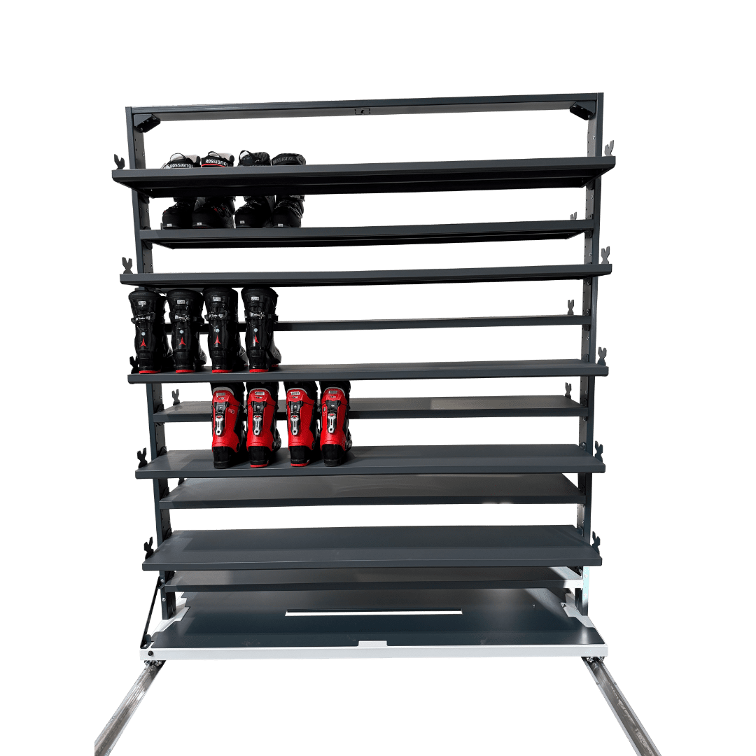 Szafa na buty seria 26 to centrum magazynowania o najwyższej wydajności. Konstrukcja z aż 10 poziomami półek pozwala przechowywać maksymalną ilość obuwia na minimalnej przestrzeni. Model w pełni zintegrowany z systemem szynowym zapewnia mobilność oraz wygodną obsługę w każdej wypożyczalni.